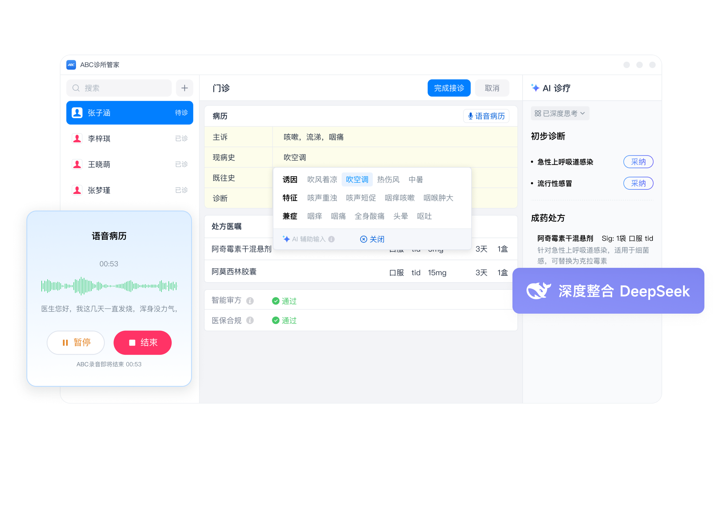 全面整合患者信息,AI 智能生成个性化诊疗方案与处方建议,中西医均支持,覆盖诊所常见病种,准确率高达 98%