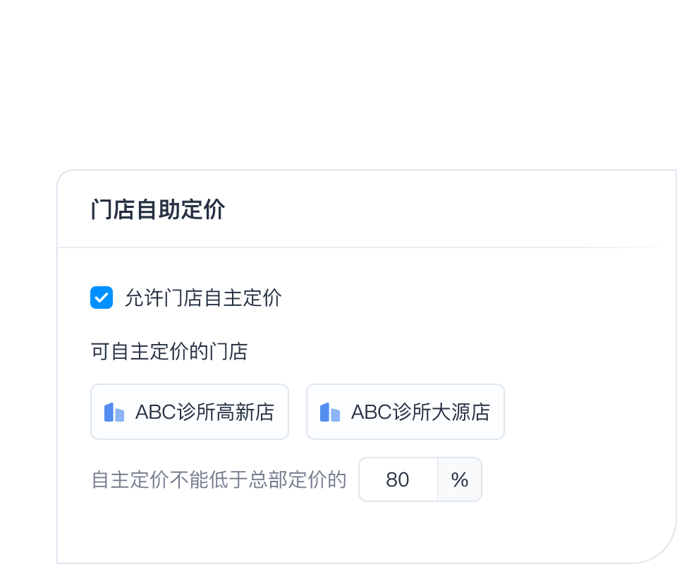 总部统一设置和管理诊疗项目、营销活动及定价,同时允许门店自主定价,实现标准化管理与门店个性化灵活性。