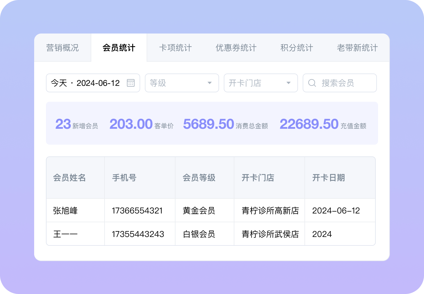 便捷查看会员增长量、消费金额、客单价、充值金额等数据,帮助诊所掌握会员情况,优化运营策略。