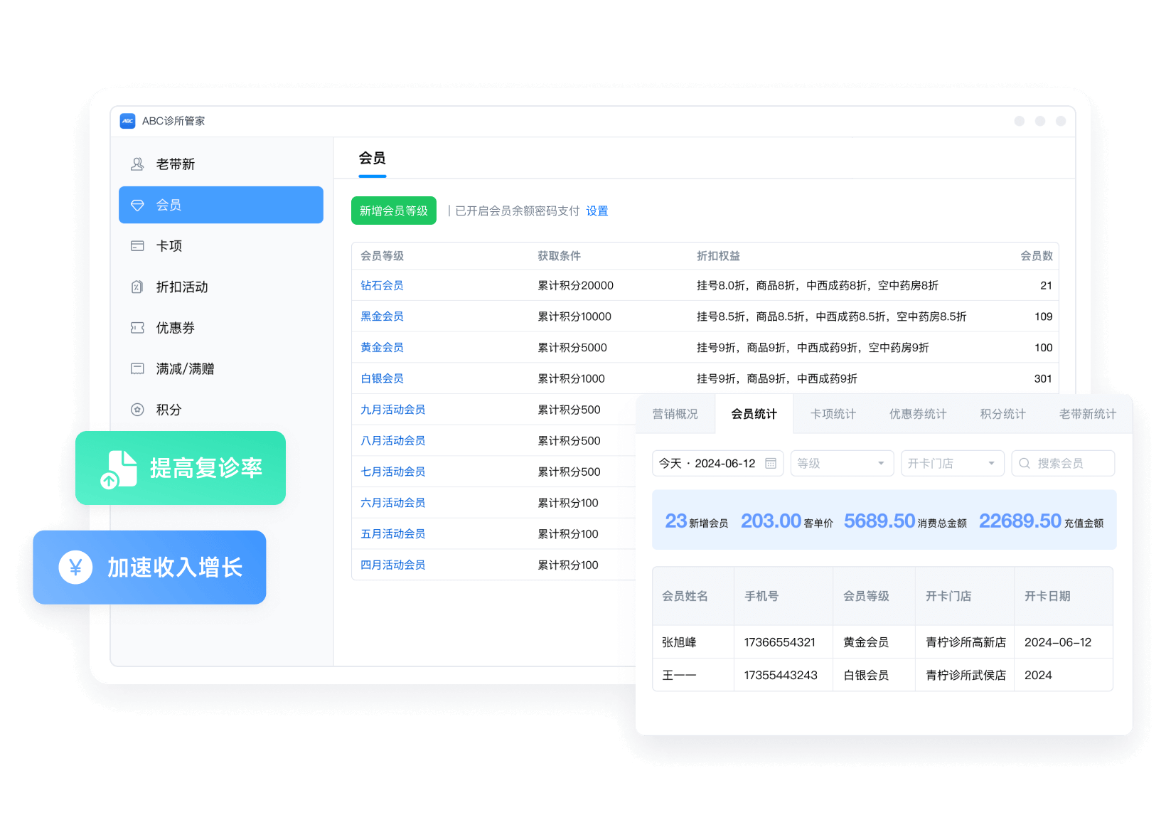 根据会员等级提供相应的权益,如折扣、特价、专属会员预留号等,增强患者的忠诚度和满意度。