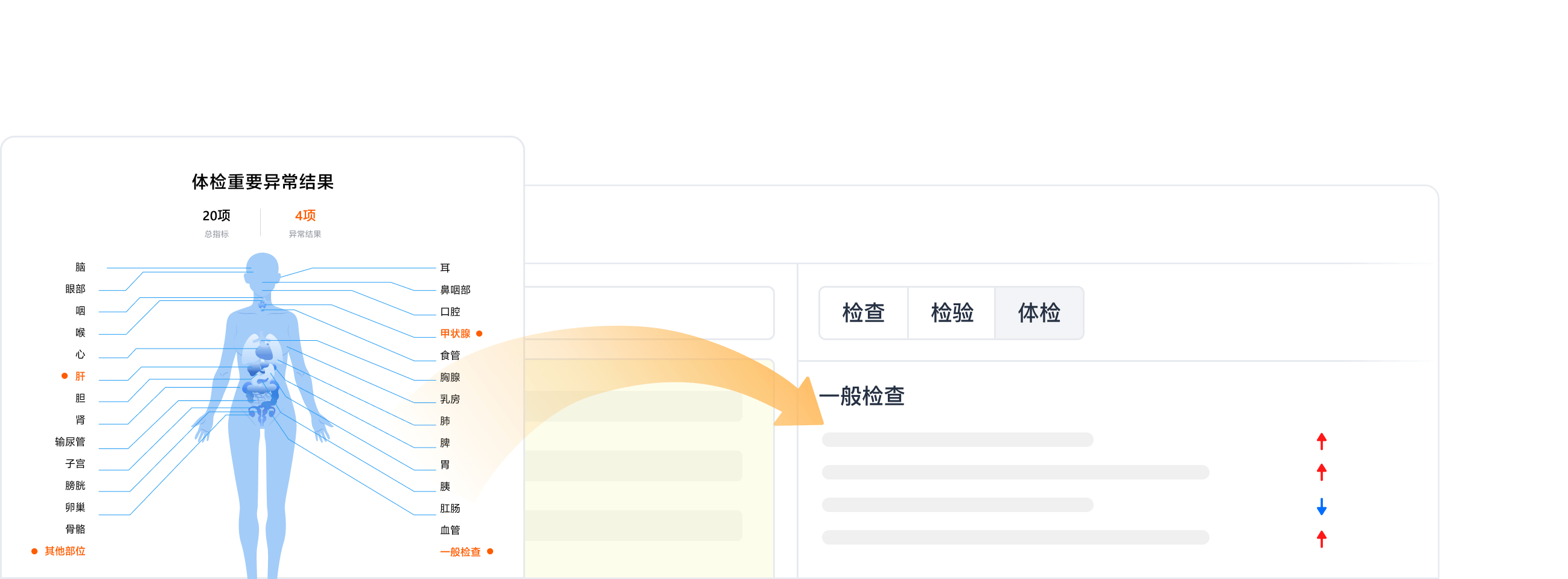 体检数据自动归集至患者档案,智能识别异常指标并引导复诊,完整呈现历史记录,实现"筛查-预警-转化"服务闭环,提升医院营收效率。
